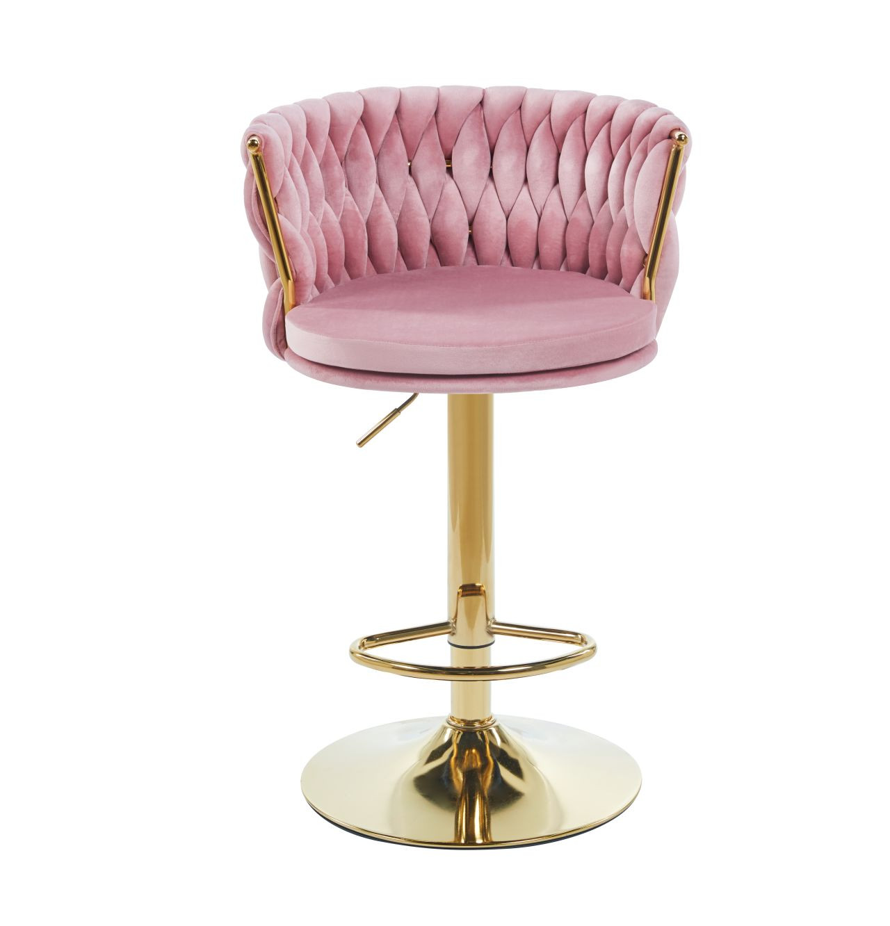 Wymiary: - wysokość siedziska: 60-80 cm - wysokość całkowita: 84-104 cm - wysokość oparcia: 25 cm - szerokość siedziska: 44 cm - szerokość całkowita: 53 cm - głębokość siedziska: 44 cm Materiał - tapicerka: velvet - stelaż: chrom Kolor: - siedzisko: różowy - stelaż: złoty