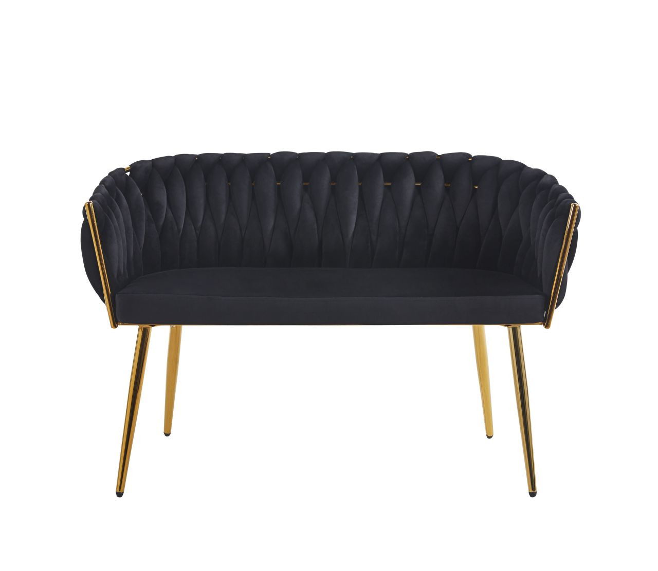 Wymiary: - szerokość siedziska: 96 cm - szerokość całkowita: 114 cm - wysokość siedziska: 48 cm - wysokość całkowita: 76 cm - głębokość siedziska: 43 cm Materiał - tapicerka: velvet - stelaż: chrom Kolor: - siedzisko: czarne - stelaż: złoty