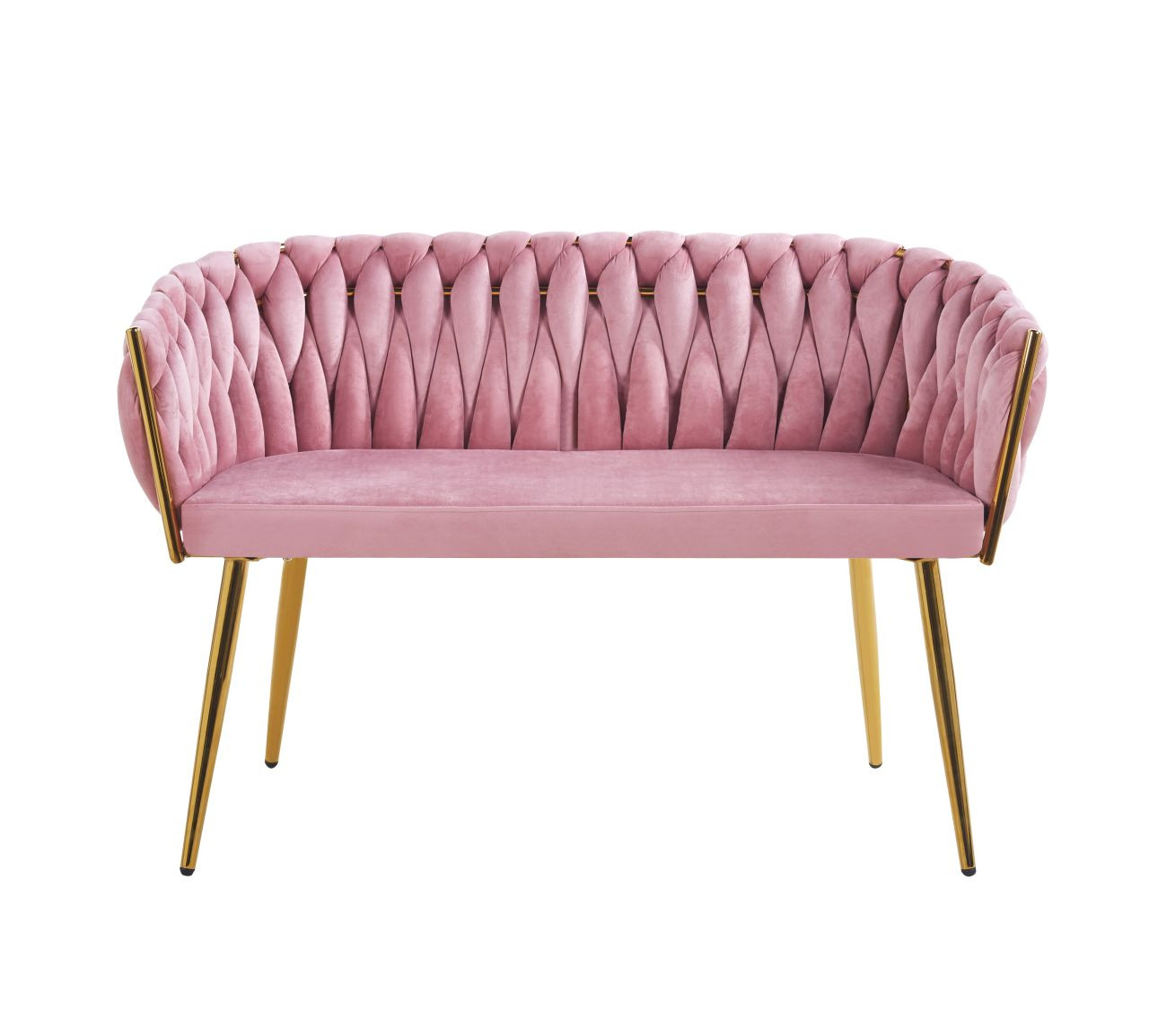 Wymiary: - szerokość siedziska: 96 cm - szerokość całkowita: 114 cm - wysokość siedziska: 48 cm - wysokość całkowita: 76 cm - głębokość siedziska: 43 cm Materiał - tapicerka: velvet - stelaż: chrom Kolor: - siedzisko: różowy - stelaż: złoty